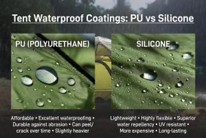 Nylon's waterproofing requires a helping hand. On its own, the fiber is not especially water-resistant. Tent manufacturers solve this with coatings — silicone (sil-nylon), polyurethane (PU), or a combination of both — applied to the fly or both layers. DWR (durable water repellent) treatments are added on top to encourage water to bead off rather than soak in.